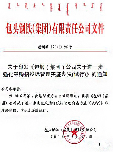 下一條:關(guān)于印發(fā)《包鋼(集團)公司關(guān)于進一步強化采購招投標管理實施辦法(試行)》的通知